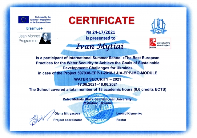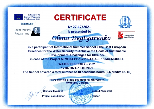 17 - 18 червня 2021 року доценти кафедри біології тварин факультету тваринництва та водних біоресурсів Олена Дегтяренко та Іван Митяй взяли участь у Міжнародній літній школі "Кращі Європейські практики з безпеки водних ресурсів задля досягнення цілей сталого розвитку: виклики для України", яка відбулася в он-лайн форматі в рамках проєкту програми ЕРАЗМУС+ Жана Моне.