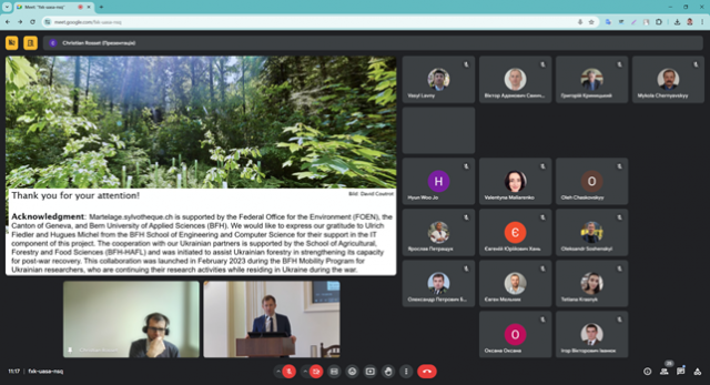 Професор Школи сільськогосподарських, лісових та харчових наук (School of Agricultural, Forest and Food Sciences (HAFL) Бернського університету прикладних наук (Bern University of Applied Sciences) у Швейцарії Christian Rosset представив доповідь про наближене до природи лісівництво та презентував програмний продукт, який розроблено під його керівництвом в HAFL (BFH) – martelage.sylvotheque.ch. Згадана онлайн-платформа включає в себе текстову, графічну, просторову інформацію з різноманітними елементами аналізу даних, а також візуальну інформацію про лісову ділянку у вигляді панорам з оглядом 360°. Систтема martelage.sylvotheque.ch є корисною для науковців, навчання студентів та поширення кращих практик лісогосподарської діяльності серед практиків-лісівників. За допомогою панорамних візуалізацій можна демонструвати та аналізувати зі студентами різні типи лісів та різні елементи (хвороби, шкідники, біорізноманіття тощо) в різних частинах Європи.