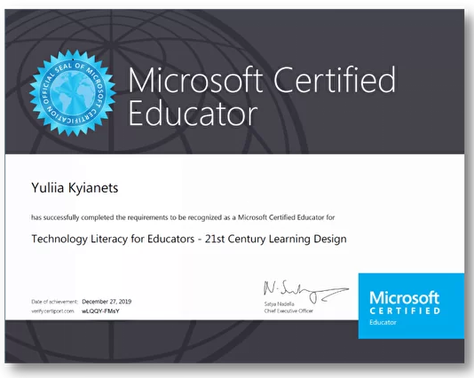 Сучасний викладач, який прагне йти в ногу з часом, потребує сертифікації навичок використання новітніх освітніх технологій. Програми професійного розвитку та сертифікації Microsoft Certified Educator (Technology Literacy for Educators- 21st Century Learning Design) підтверджують, що викладач: