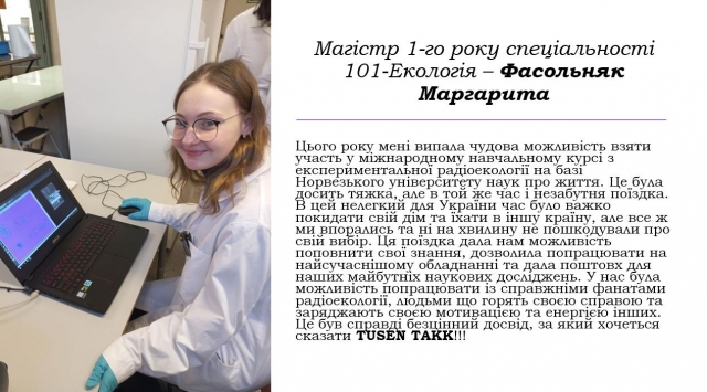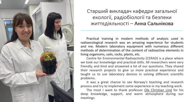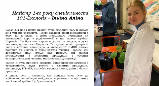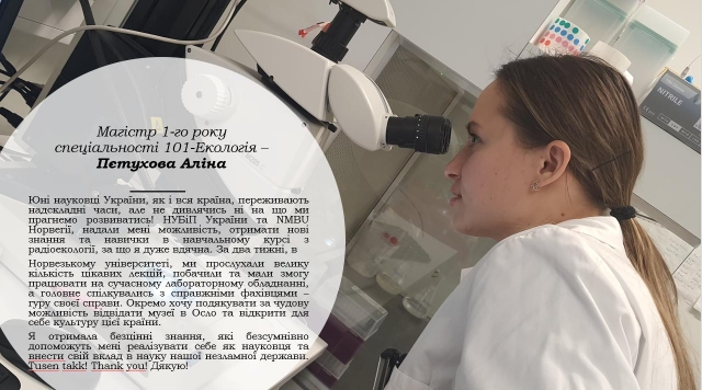Студенти НУБіП України факультету захисту рослин, біотехнологій та екології, а саме Аліна Ільїна, Аліна Пєтухова освітньо-професійна програма «Екологічний контроль та аудит», Маргарита Фасольняк освітньо-професійна програма «Охорона навколишнього середовища», разом з Анною Сальніковою старшим викладачем кафедри загальної екології та безпеки життєдіяльності відвідали Норвезький університет природничих наук (NMBU – Norwegian University of Life Sciences). У рамках навчально-наукового проєкту міжнародного співробітництва понад два тижні, з 25 листопада по 12 грудня 2022 року, вони проходили практичне навчання сучасним методам аналізу, що використовуються у радіоекологічних дослідженнях.