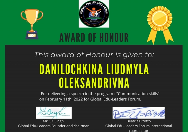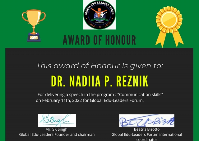 11 лютого 2022 року за сприяння Global Edu-Leader відбулася міжнародна online-конференція на тему «The effect of coronavirus on communication skills», в якій взяли участь представники з Бразилі, Індії, Мексики, Пакистану, Перу та України. Організаторами виступили: доктор С.К. Сінгх з Індії, докторка Беатріз Бізотто та професорка Рената Замбоні з Бразилії. На зустрічі науковці разом зі студентами обговорювали теми комунікативних навичок та впливу коронавірусної пандемії на спілкування та різні сфери життя людей з різних країн. Студенти і спікери висловили свої думки, щодо актуальної теми, міжнародного спілкування та комунікування у своїй країнах та майбутнє без COVID-19.