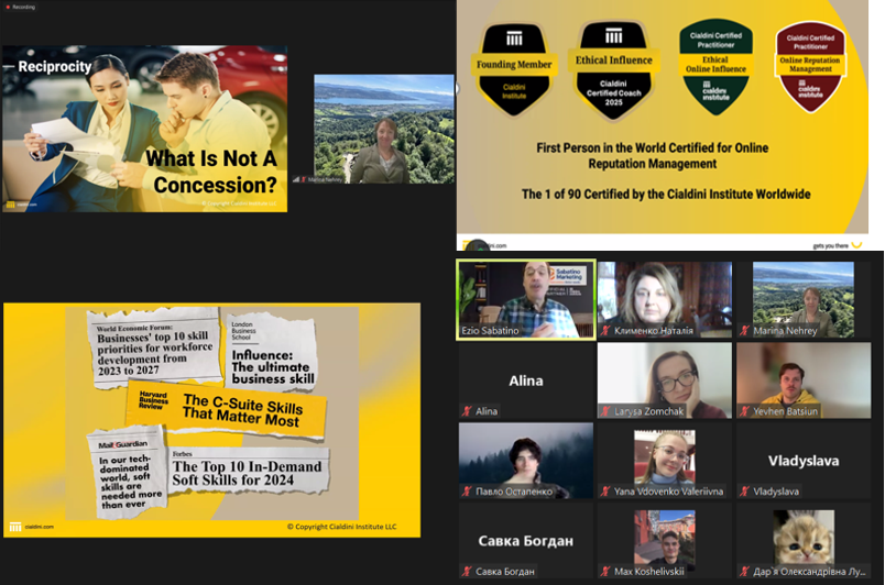 Сьогодні спікером був Езіо Сабатіно, CCP, CEIP, COIP, CORMP — досвідчений маркетолог у сфері B2B/B2C з понад 30-річним стажем у створенні брендів, збільшенні доходів та керівництві високопродуктивними командами в різних секторах. Езіо є головним директором з впливу в Sabatino Marketing та засновником Cialdini Institute, де він входить до числа лише 90 світових професіоналів, сертифікованих доктором Робертом Чалдіні в галузі етичного впливу. Його кваліфікація охоплює етичний вплив, етичний вплив в Інтернеті, і він був першим у світі, хто отримав сертифікат з етичного управління репутацією в Інтернеті.