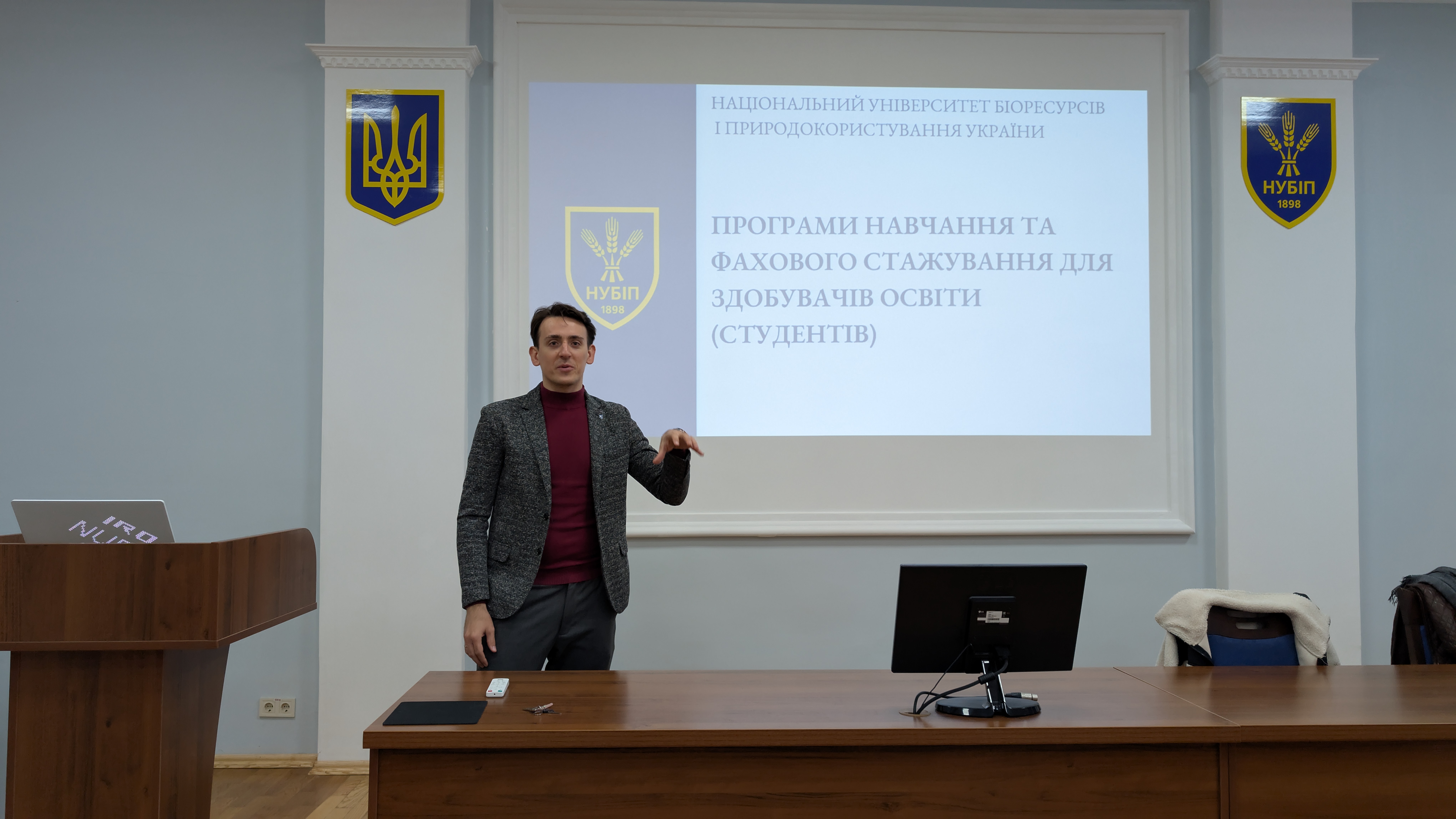 7 жовтня 2025 року в аудиторії №79 першого корпусу НУБіП України відбулася зустріч із більше, ніж 80 студентами, присвячена міжнародним програмам навчання та стажування. Захід об'єднав всіх зацікавлених із ННІ лісового і садово-паркового господарства, факультету захисту рослин, біотехнологій та екології, а також факультету тваринництва та водних біоресурсів.