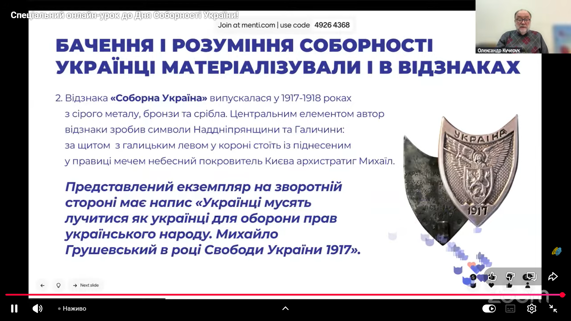 Значне зацікавлення аудиторії викликала доповідь Олександра Кучерука, завідувача відділу Національного музею історії України, присвячена особливостям проголошення Акту Злуки 22 січня 1918 року та відродженню української державності у 1990-1991 роках.