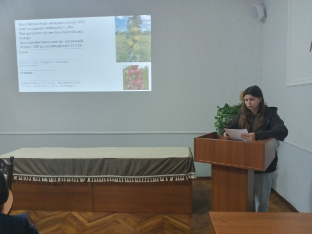 4. Дементьєва Вікторія, наук. керівник – д.ф. сад. Гаврилюк О.С. «Оцінка потенціалу продуктивності сортів та гібридів яблуні колоноподібного типу» з галузі знань «Агрономія» – 87 бали – ІІ місце.