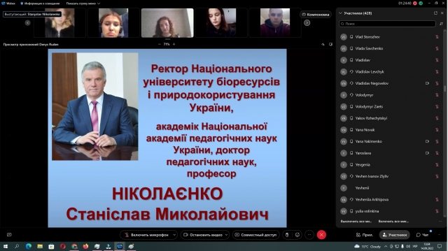 Зустріч відбулась вчасно та пройшла максимально продуктвно, незважаючи військову та епідеміологічну ситуацію в країні. До зустрічі доєдналися понад 100 учасників з факультету захисту рослин, біотехнологій та екології. Першим молодь вітав ректор університету Станіслав Ніколаєнко, який зазначив, що за 124-річну історію заклад випустив близько 200 тисяч фахівців, серед яких велика кількість відомих людей: науковців, політиків, громадських діячів. Однак, присутній тут молоді, певен очільник університету, під силу зробити навіть більше. Ректор зауважив, що першокурсники стали вступниками особливого 125 року набору. Станіслав Ніколаєнко у традиційній манері побажав першокурсникам: «Синього неба, чистої води і ніякої біди!»