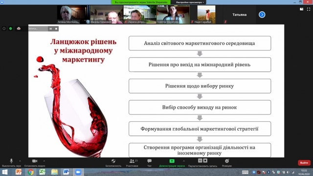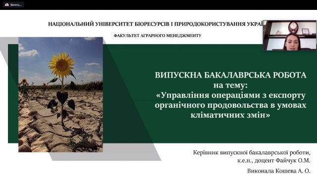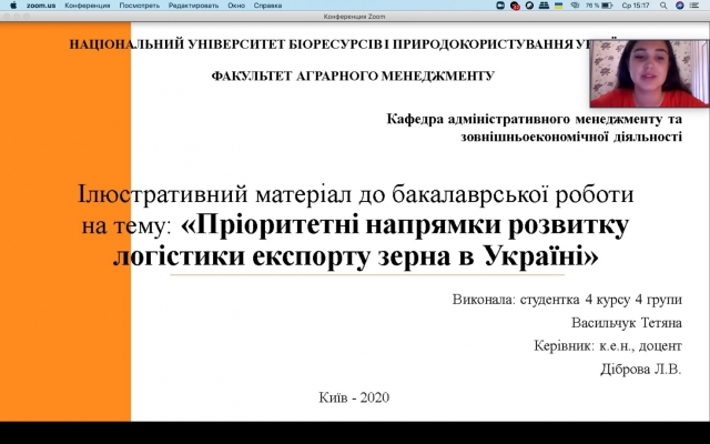 На виконання розпорядження декана факультету аграрного менеджменту №674 від 09 червня 2020 р. на кафедрі адміністративного менеджменту та ЗЕД у середу – 10 червня 2020р. розпочалися захисти бакалаврських робіт студентів спеціальності «Менеджмент» спеціалізації «Менеджмент ЗЕД» денної форми навчання. Організовувати та оцінювати захист, згідно наказу ректора №377 від 22 травня 2020 р., було доручено комісії у складі: Горьовий В.П., професор кафедри менеджменту ім. проф. Й.С. Завадського, д.е.н., професор (голова комісії); Мостенська Т.Л., завідувач кафедри адміністративного менеджменту та ЗЕД, д.е.н., проф.; Діброва Л.В., доцент кафедри адміністративного менеджменту та ЗЕД, к.е.н., доцент; Файчук О.М., доцент кафедри адміністративного менеджменту та ЗЕД, к.е.н., доцент; Сарабай Н.С., асистент кафедри адміністративного менеджменту та ЗЕД (секретар комісії).