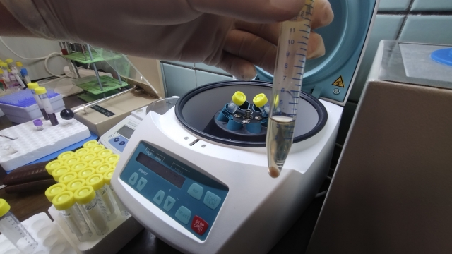 Для проведення PRP- терапії була проведена процедура відбору 10 мл венозної крові в спеціальні пробірки, які мають спеціальний компонент, що перешкоджає коагуляції. При проведенні центрифугування з використанням спеціальної центрифуги кров була розділена на еритроцитарну масу та плазму з високим вмістом тромбоцитів. На виході ми отримали 0,7 мл тромбоцитарного концентрату. Важливим в проведенні PRP- терапії є не кількість отриманої плазми, а саме концентрація тромбоцитів. Регенеративні процеси запускаються лише при збільшенні концентрації тромбоцитів у рази.