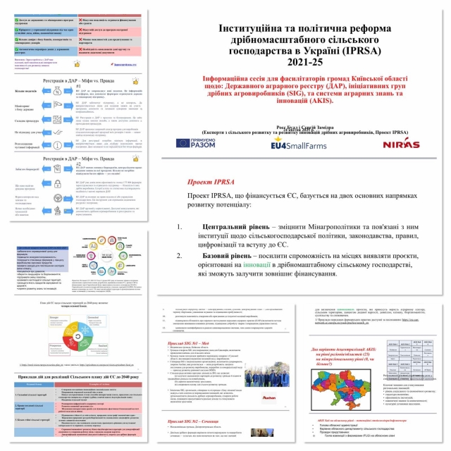 Проект інституційної та політичної реформи дрібномасштабного сільського господарства (IPRSA) фінансується Європейським Союзом з метою зміцнення Мінагрополітики та пов’язаних з ним інституцій щодо сільськогосподарської політики, законодавства, правил цифровізації та вступу до ЄС. Він спрямований на посилення спроможності виявлення та реалізації проєктів, орієнтованих на інновації в дрібномасштабному сільському господарстві, які сприятимуть залученню зовнішнього фінансування. Програма семінару передбачала ознайомлення учасників щодо Державного аграрного реєстру (ДАР), ініціативних груп дрібних агровиробників (SIG) та системи аграрних знань та інновацій (AKIS).