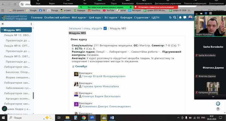 Відповідно до прийнятого рішення, навчання у лютому розпочато у дистанційній формі. Незважаючи на нестачу світла, тепла та інтернету, і студенти, і викладачі в повній мірі розпочали новий семестр задля опанування знань з таких фахових предметів кафедри ветеринарної хірургії ім. акад. І.О. Поваженка як "Загальна і спеціальна хірургія", "Анестезіологія", "Оперативна хірургія" та "Хвороби собак і котів".