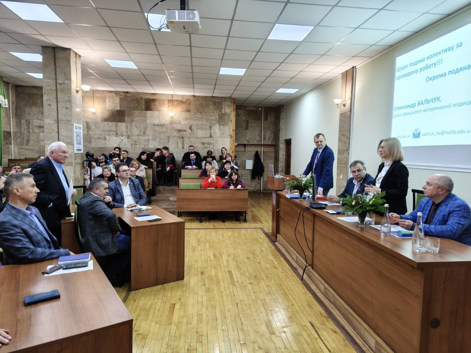 В обговоренні звіту декана активну участь взяли співробітники факультету, зокрема: голова Вченої Ради факультету Микола ЦВІЛІХОВСЬКИЙ, директор НДІ здоров'я тварин Сергій ГОЛОПУРА; завідувачі кафедр: Микола МАЛЮК, Олег МЕЛЬНИК, Олена ЖУРЕНКО, професор Валерій УШКАЛОВ, доцент Олександр МАРТИНЮК та голова Сенату студентської організації факультету ветеринарної медицини Іван КОВТУН.
