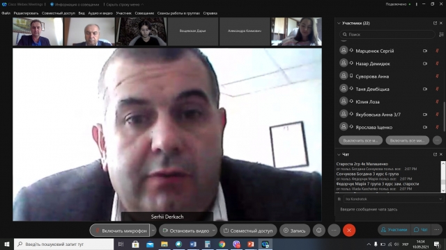 Заступник декана Сергій Деркач у своєму виступі нагадав старостам про своєчасність подання інформації стосовно додаткових балів старостами академічних груп. Нагадав студентам про особливості нарахування соціальної стипендії для певних категорій студентів, зосередив увагу на протиепідеміологічних правилах в умовах пандемії COVID-19, які потрібно дотримуватись, перебуваючи у навчальних корпусах університету та гуртожитку.