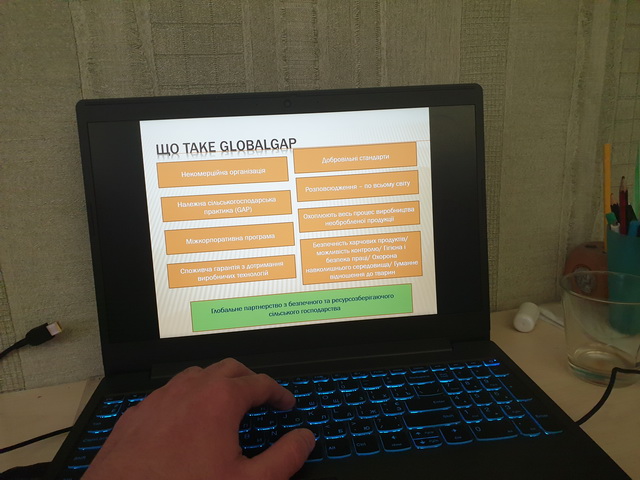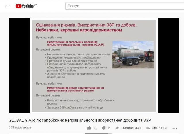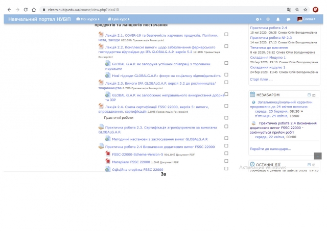 За відсутності аудиторних занять та можливості достатнього прямого діалогу між викладачем та студентами в нагоді стали записи вебінарів та відеоматеріалів за тематикою ознайомлення з вимогами GLOBALG.A.P. та практик їх дотримання в умовах агропідприємств. Так, як лектор є визнаним фахівцям зі стандартів GLOBALG.A.P., головою Національної технічної робочої групи GLOBALG.A.P. в Україні та співпрацює з Проектом USAID «Підтримка аграрного і сільськогосподарського розвитку» то в доробку наявна достатня кількість відеоматеріалів, методичних настанов та необхідної інформації, яка знаходиться у вільному доступі на YouTube, ISSUU та інших доступних платформах.