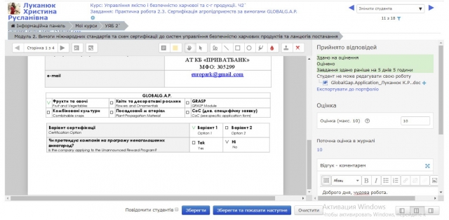 Після ознайомлення з теоретичними матеріалами студентам була поставлена мета правильно оформити заявку на сертифікацію на відповідність вимогам GLOBALG.A.P. з врахуванням всіх можливих варіантів сертифікації, умов паралельного виробництва, виробництва об’єднанням виробників, виключенням врожаю тощо.
