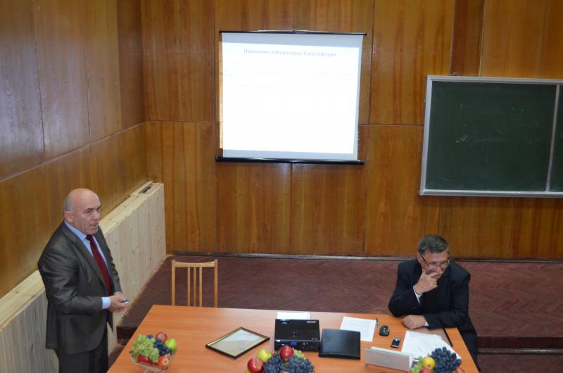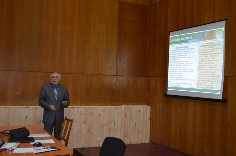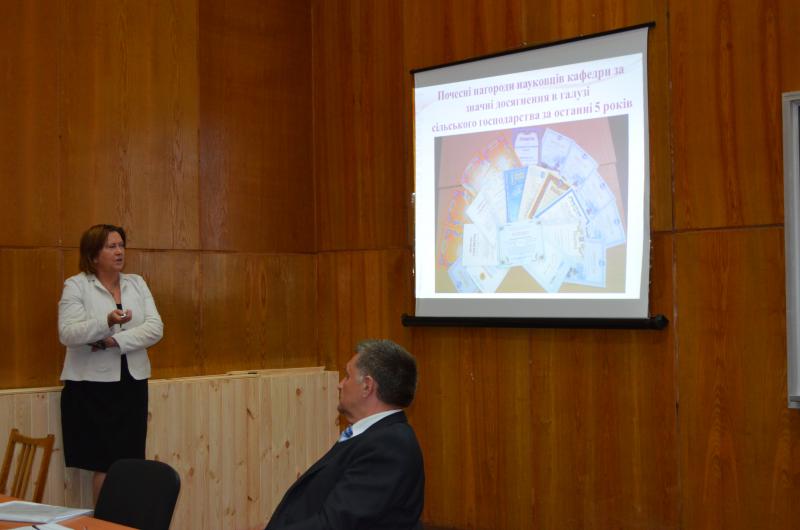 Завідувач кафедри кормовиробництва, меліорації і метеорології, професор Демидась Г.І. показав різні види проведеної роботи, зокрема оснащення навчальних аудиторій, забезпечення науково-дослідної бази, зупинився на завданнях оновлення навчально-методичного фонду кафедри, проведення навчальної й наукової роботи на сучасному рівні.