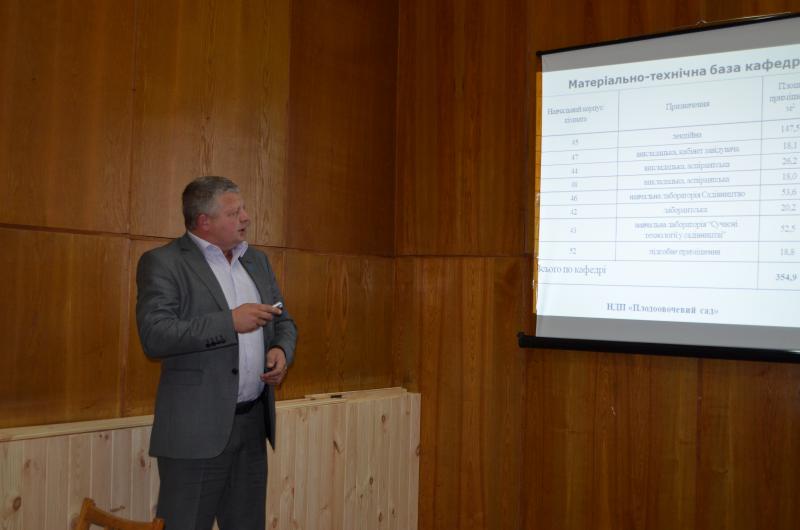 Завідувач кафедри садівництва, доцент Мазур Б.М. зосередив свою увагу на підготовчому етапі введення нової спеціальності «Садівництво і виноградарство», розвитку навчальної й дослідної роботи на базі НВП «Плодоовочевий сад», озвучив головні завдання в роботі колективу.