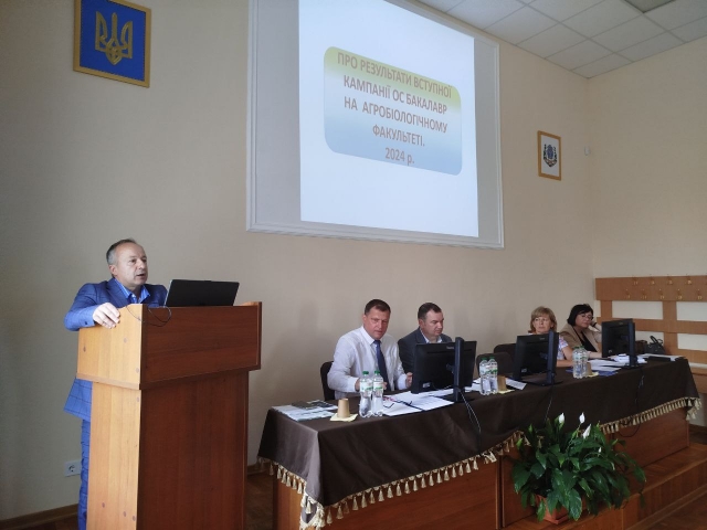 Згідно порядку денного декан виступив з інформацією про особливості організації освітнього процесу та виховної роботи на агробіологічному факультеті в умовах воєнного стану та завдання на 2024/2025 н.р. Віталій Коваленко закцентував увагу на необхідності посилення профорієнтаційної роботи серед НПП та студентів, розповів про складнощі вступної кампанії в поточному році. Звернув увагу на наукову діяльність факультету та закликав науковців до подання міжнародних проєктів, підвищення публікаційної активності. З радістю повідомив про успіхи в напрямку розвитку програми подвійних дипломів для агрономів. Також повідомив про відкриття на факультеті 3 вересня лабораторії "Біологія грунтів".