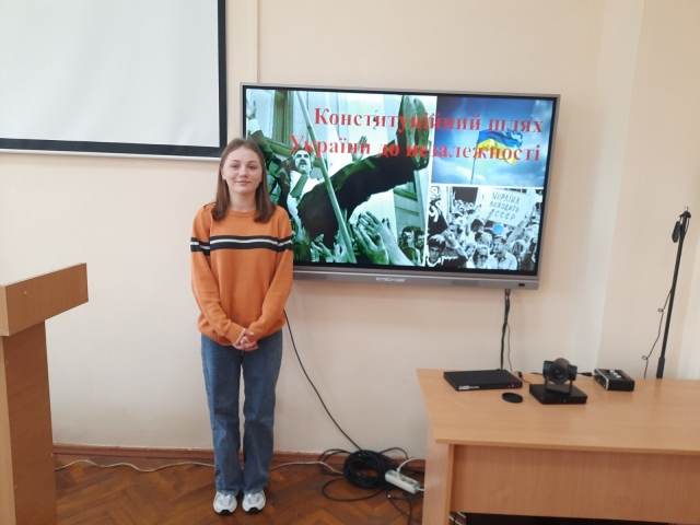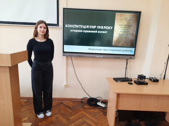 2) студентка 1 курсу Волкова Каріна Вадимівна з науковою роботою «Конституція УНР 1918 року: історико-правовий аспект». Студентський науковий гурток «Історико-правничі студії» (науковий керівник – Ірина Єрмоленко) - 90 балів;