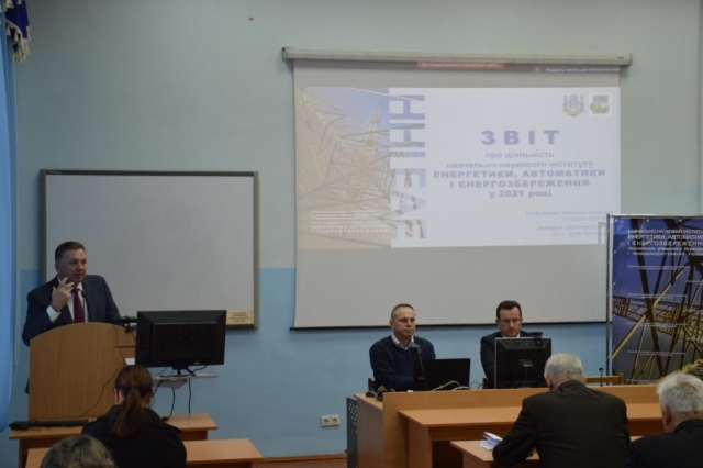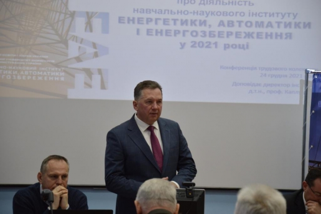 Після оголошення порядку денного та затвердження регламенту, було надано слово для звіту за 2021 рік директору ННІ енергетики, автоматики і енергозбереження, професору Віктору Каплуну.