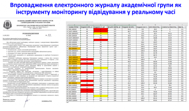 Відповідно до розпорядження проректора з науково-педагогічної роботи в інституті у якості апробації впроваджується інформаційна система моніторингу відвідування занять «Електронний журнал», розроблені силами співробітників ННІ. Для адміністрування системи у реальному часі долучені не тільки викладачі та наставники, а й старости. Вперше, дирекція ННІ має змогу одержувати щоденні звіти про стан відвідуваності занять. Аналіз цієї роботи є важливим чинником у забезпечення якості навчання.