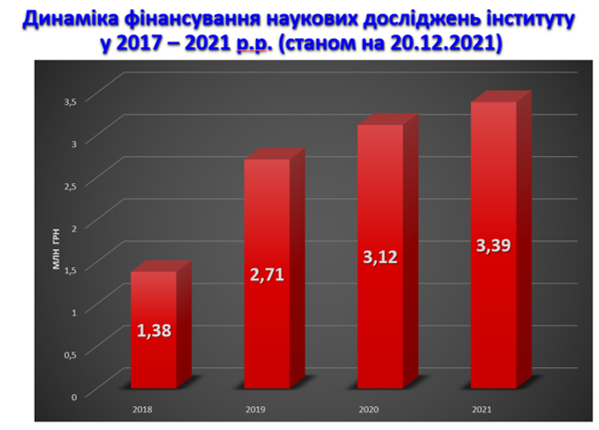 Разом по інституту у 2021 р. було профінансовано науково-дослідних робіт та договорів з надання послуг на суму 3579,6 тис. грн. (на 0,5 млн. грн. більше ніж у 2020 р. і на 2,5 млн. грн. більше ніж у 2018 році).