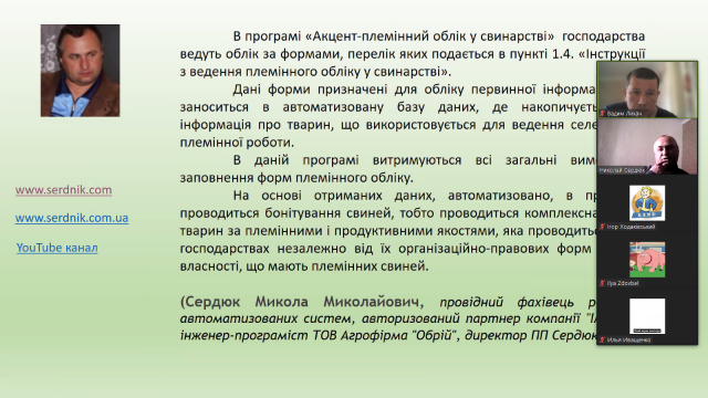 Так, 13.05.2022 р. для здобувачів вищої освіти ОС «Бакалавр» ІV курсу в рамках вивчення курсу дисципліни «Технологія виробництва продукції свинарства» згідно робочої програми та основного розкладу на запрошення ведучого викладача проф. Лихача Вадима відгукнувся і приєднався в якості лектора – Сердюк Микола, розробник комп’ютерної прогами з ведення племінного і господарського обліку у свинарстві «Акцент – племінний облік у свинарстві».