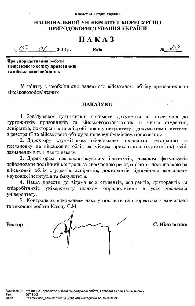 НАКАЗ № 20 Про впорядкування роботи з військового обліку призовників та військовозобов’язаних пт, 23 січ 2015 - 02:00