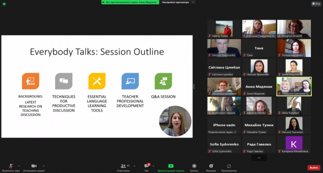 Запрошений спікер вебінару Оксана БАУДАРБЕКОВА - кандидат педагогічних наук зі спеціальності "Теорія і методика навчання (германські мови)", експерт National Foreign Language Center, University of Maryland Global Campus (США), випускниця програми American Conversational English від Джорджтаунського університету, м. Вашингтон, член асоціації TESOL, у вступній промові подякувала оргкомітету заходу за запрошення до співпраці. У рамках представленої сесії “Everybody Talks: Keys to Effective Discussion” Оксана БАУДАРБЕКОВА ознайомила учасників заходу з новітніми тенденціями в навчанні англомовного говоріння, зокрема формування навичок ефективної дискусії, а також показала шляхи застосування сучасних технологій на заняттях з англійської мови (icebreaker questions, OREO technique, 5-clue challenge та інші). Окремий блок вебінару було присвячено ресурсам та можливостям професійного вдосконалення, які надає Мерілендський університет, зокрема Summer Institute Series та TELL.