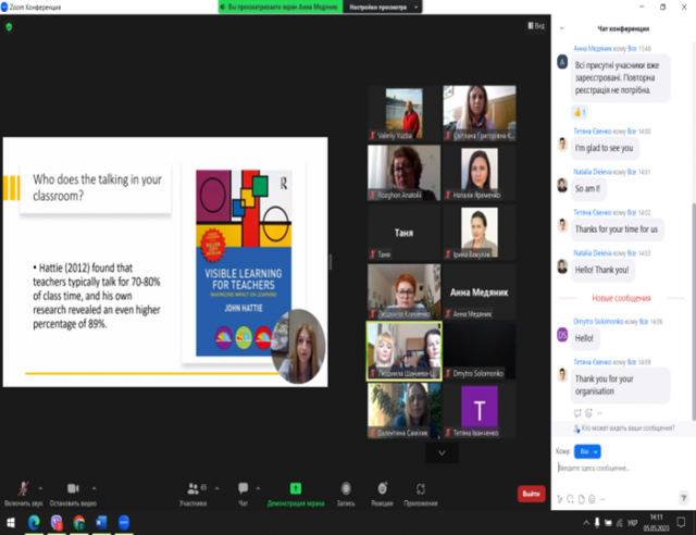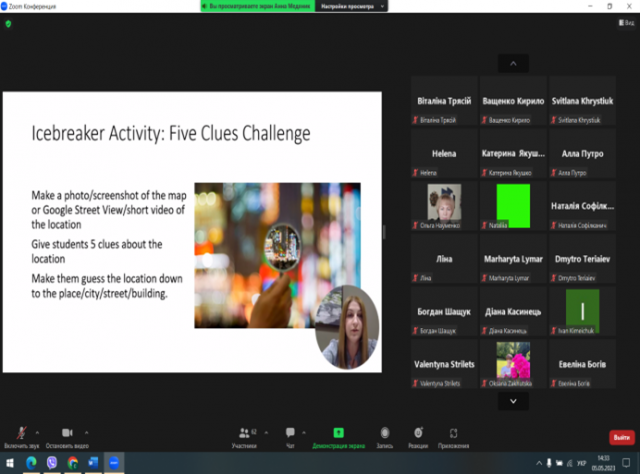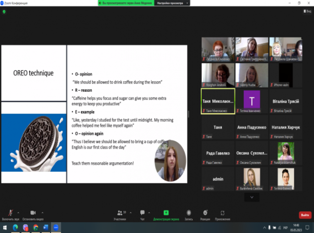 05.05.2023 р. кафедрою англійської філології за сприяння декана Гуманітарно-педагогічного факультету Інни САВИЦЬКОЇ було організовано та проведено міжнародний науково-практичний вебінар з методики навчання дискусії, присвячений 125-річчю НУБіП України, участь в якому взяли більше 120 представників закладів освіти України, США, Польщі, Люксембургу, Франції, Великої Британії, Німеччини, Угорщини та Румунії.