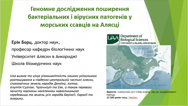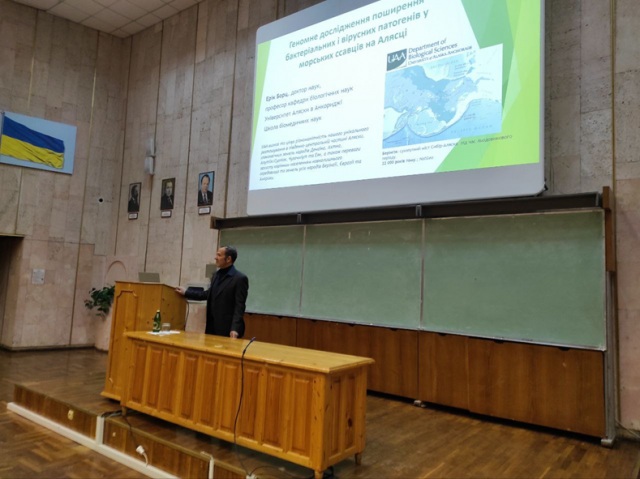 Відповідно до програми візиту 19 лютого доктор Ерік Бортц прочитав гостьову лекцію для студентів 5-6 курсу факультету ветеринарної медицини на тему «Геномні дослідження у вивченні передачі бактеріальних та вірусних патогенів у морських ссавців Аляски».