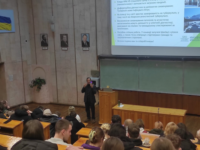 Із 17 по 21 лютого 2025 року в межах спільного проекту «Використання швидкого нанопорового секвенування (Oxford Nanopore Technologies) для нагляду за стійкістю до протимікробних препаратів в контексті Єдиного здоров’я в Україні» в Національному університеті біоресурсів і природокористування України перебував із візитом доктор Ерік Бортц, доктор філософії, доцент кафедри біологічних наук в Університеті Аляски в Анкориджі (США), який ще із 2016 року співпрацює з науковцями в Україні. Його дослідницька група займається секвенуванням геномів патогенів, зокрема туберкульозу, африканської чуми свиней, респіраторних вірусів та патогенів тварин, для розуміння резервуарів, ризику виникнення та передачі інфекцій.