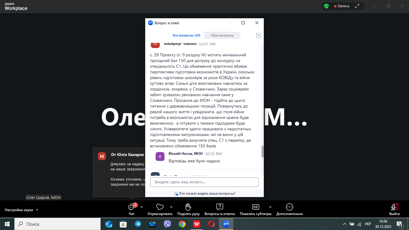 Одне з ключових змін в Проєкті (п. 9 розділу IV) містить «мінімальне значення конкурсного бала не може бути менше ніж 150 балів для спеціальностей C1 «Економіка та міжнародні економічні відносини (за спеціалізаціями)», C3 «Міжнародні відносини»». Це обмеження практично вбиває перспективи підготовки економістів в Україні, оскільки рівень підготовки школярів за роки КОВІДу та війни суттєво впав. Ініціативне звернення до МОН – підійти до цього питання з державницьких позицій. Повернутись до реалій нашого життя і усвідомити, що після війни потреба в економістах для відновлення країни буде величезною, а готувати з такими підходами буде нікого. Нащо Олег ШАРОВ відповів, що на сьогоднішній момент існує загроза переведення здобувачів зі ОП С01 на С02 та С03, тому міністерство шукає шляхи для вирішення цього питання!