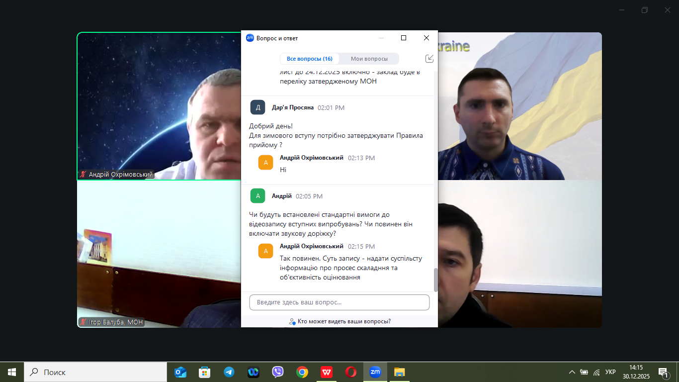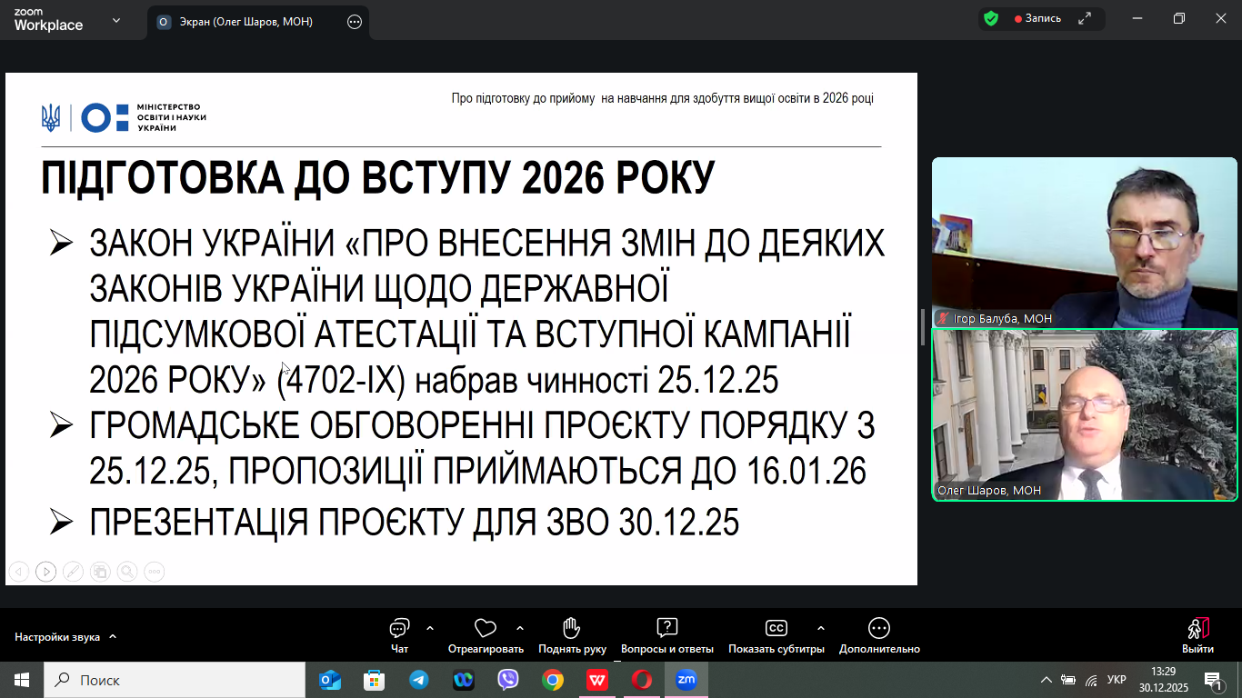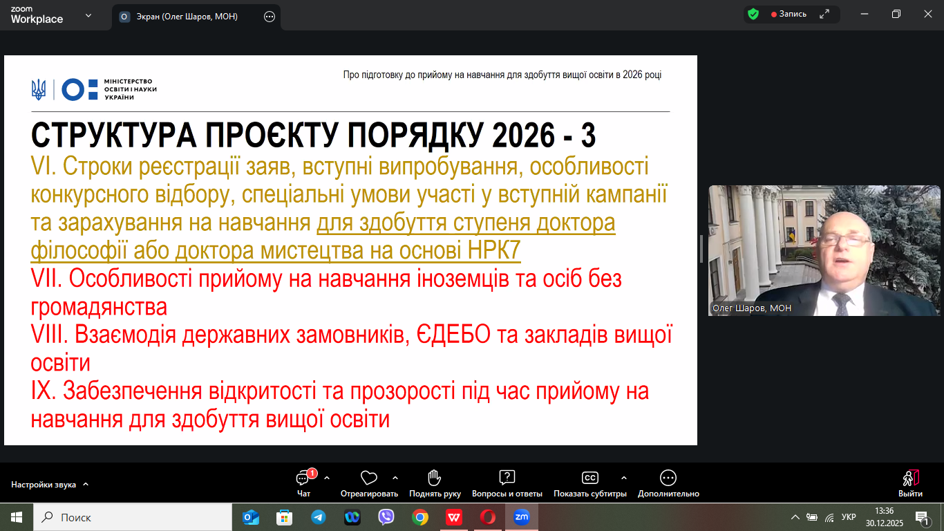 30 грудня 2026 року в онлайн-форматі відбулася нарада, на якій обговорювалися питання щодо винесення на громадське обговорення Порядку прийому на навчання для здобуття вищої освіти в 2026 році, яка зібрала понад 500 учасників з усіх регіонів України.