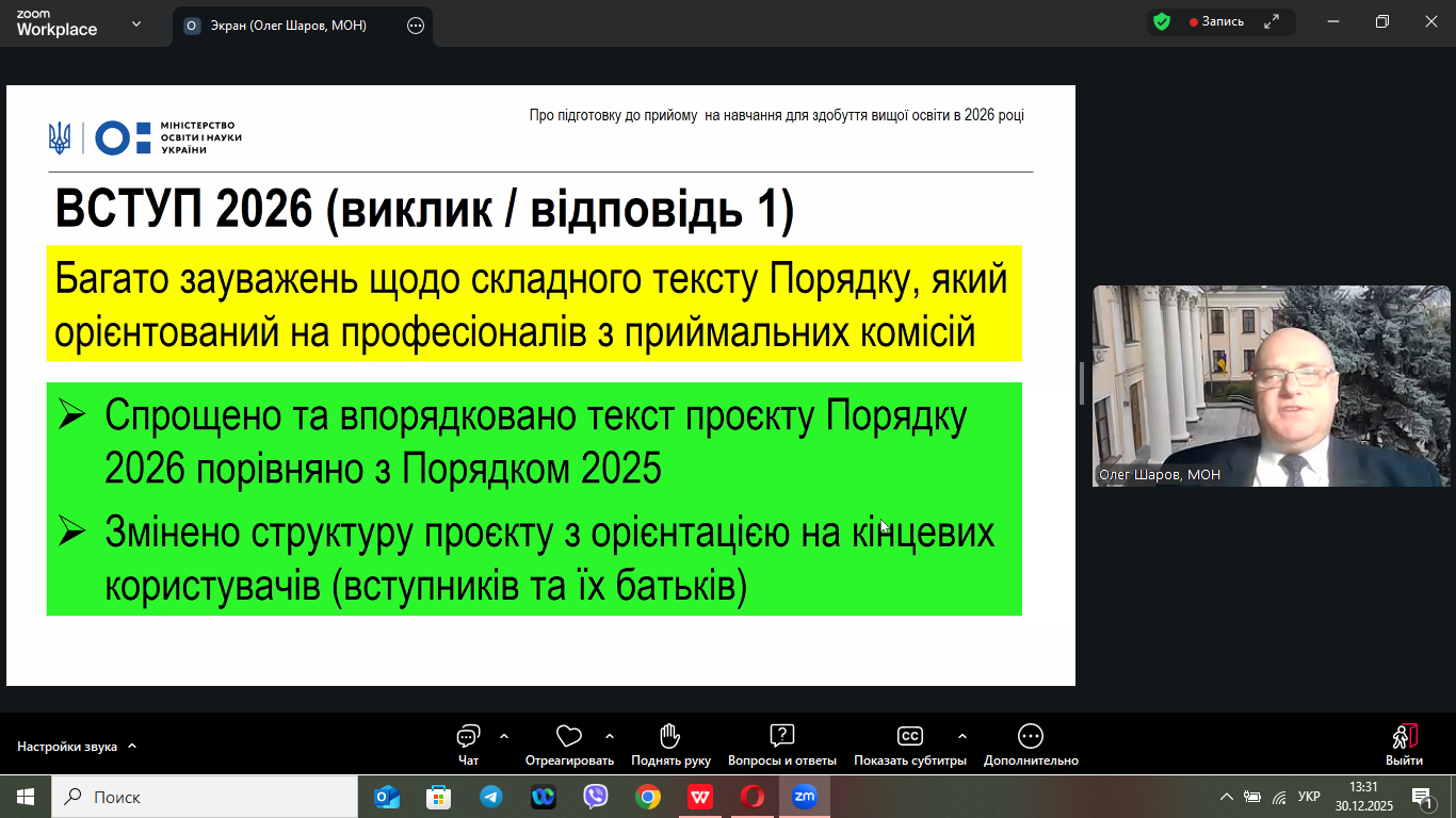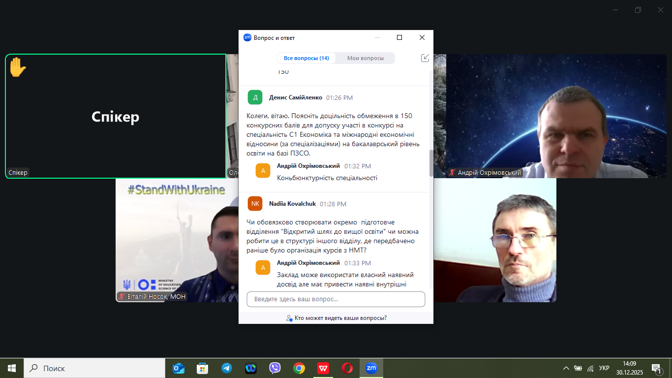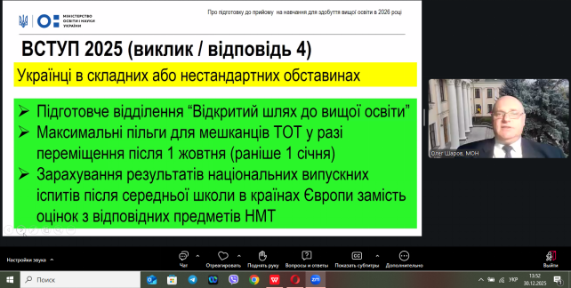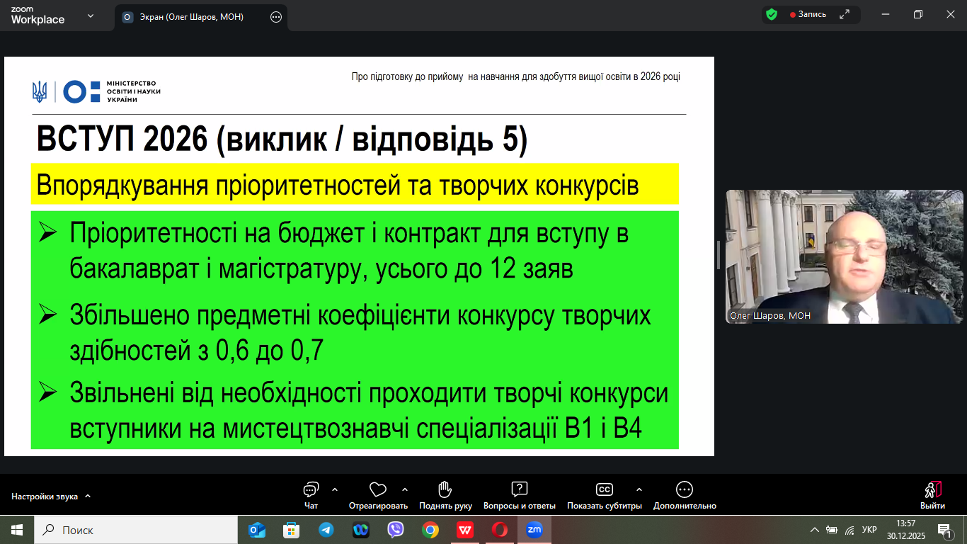 30 грудня 2026 року в онлайн-форматі відбулася нарада, на якій обговорювалися питання щодо винесення на громадське обговорення Порядку прийому на навчання для здобуття вищої освіти в 2026 році, яка зібрала понад 500 учасників з усіх регіонів України.