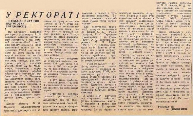 Отже, на шпальтах газети № 3, від 12 лютого 1991 року, М. Яковенко у публікації «У ректораті» вів репортаж з засідання ректорату. Розглядалися актуальні на той час питання вузівського життя, наприклад, створення на базі лісогосподарського факультету кафедри тропічного рослинництва та кафедри озеленення. Далі декан ЗІФ Б. М. Гопка підняв питання про відвідування студентами бібліотеки, лекцій і інших занять: «Ректор, проректори М.М. Кирик, В. Д. Кулик говорили про те, що варто запозичити корисного з організації навчального процесу у вузах Канади, Бельгії, ФРН, Франції, США, Китаю, Польщі та ін. країн, де нашим викладачам у різний час траплялося бути». На завершення засідання декан факультету громадських професій С. А. Семеновський звернувся до присутніх з проханням активізуватися в підготовці до «Голосіївської весни – 1991».