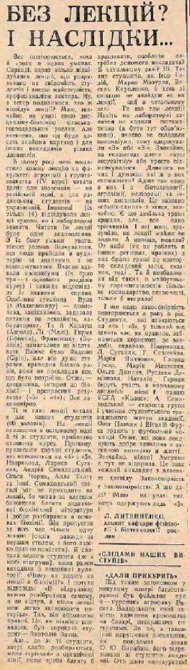 Проблема успішності і сумлінного ставлення до навчання порушується неодноразово. От і в № 4 від 26 лютого, доцент кафедри фізіології і біотехнології рослин Л. Литвиненко у статті «Без лекцій? І наслідки…» теж виклала своє бачення про позитивні і негативні сторони учбового процесу: «Зараз вільне відвідування лекцій, що розраховано на свідомість студентів і високу майстерність, професіоналізм лектора. Ну, а тепер подивимося, хто ж відвідує лекції? Маю, звичайно, на увазі свою дисципліну - біохімію сільськогосподарських рослин…