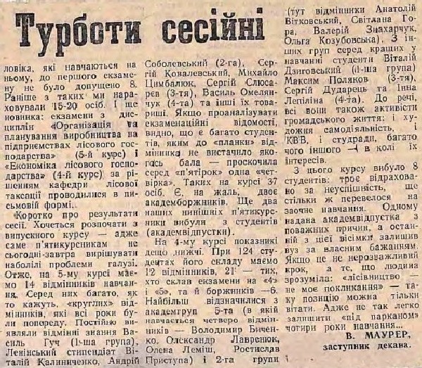 Віктор Мауер зазначає, що «на 5-му курсі лісогосподарського факультету маємо 14 відмінників навчання…, Якщо проаналізувати екзаменаційні відомості, видно, що є багато студентів, яким до «планки» відмінника не вистачило якогось балу – проскочила одна четвірка. Таких на курсі 37 осіб. Є, на жаль, двоє академборжників…»