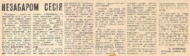 У газеті № 19 за 24 грудня надрукована інформація начальника учбової частини В. Рябченка «Незабаром сесія», де автор звертається до керівників факультетів щодо складання розкладу екзаменів і зазначає, що «..мають допускати до них лише тих студентів, які виконали весь обсяг необхідних практичних, лабораторних та інших програмних робіт з тієї чи іншої дисципліни. Студентам, які мають менше трьох академічних заборгованостей, виділити для їх ліквідації місяць – починаючи з дня складання останнього екзамену на даному курсі. … Студенти, які мають три і більше академзаборгованості на момент закінчення сесії чи хоча б одну після встановленого строку ліквідації, відраховуються з вузу. Про це варто пам’ятати і сесію складати якомога краще.» Далі В. Рябченко наводить критерії, якими керується викладач для оцінювання відповіді студента. Для контролю за ходом сесії було створено комісію, до якої можна звертатися при виникненні питань, щодо ходу сесії.