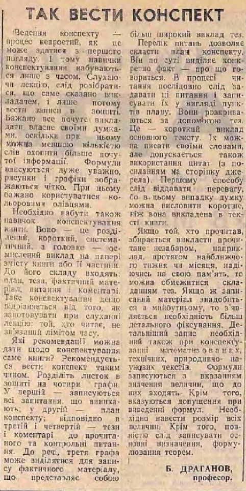 На допомогу в навчанні студентам професор Б. Драганов у публікації «Так вести конспект» (№ 5 за 12 березня) дає поради як вести конспект лекцій викладача: «…слухаючи лекцію, слід розібратися, що саме сказано викладачем, і лише потому вести записи в зошиті. Бажано все почуте викладати власне своїми думками, оскільки при цьому можна меншою кількістю слів охопити більше почутої інформації»