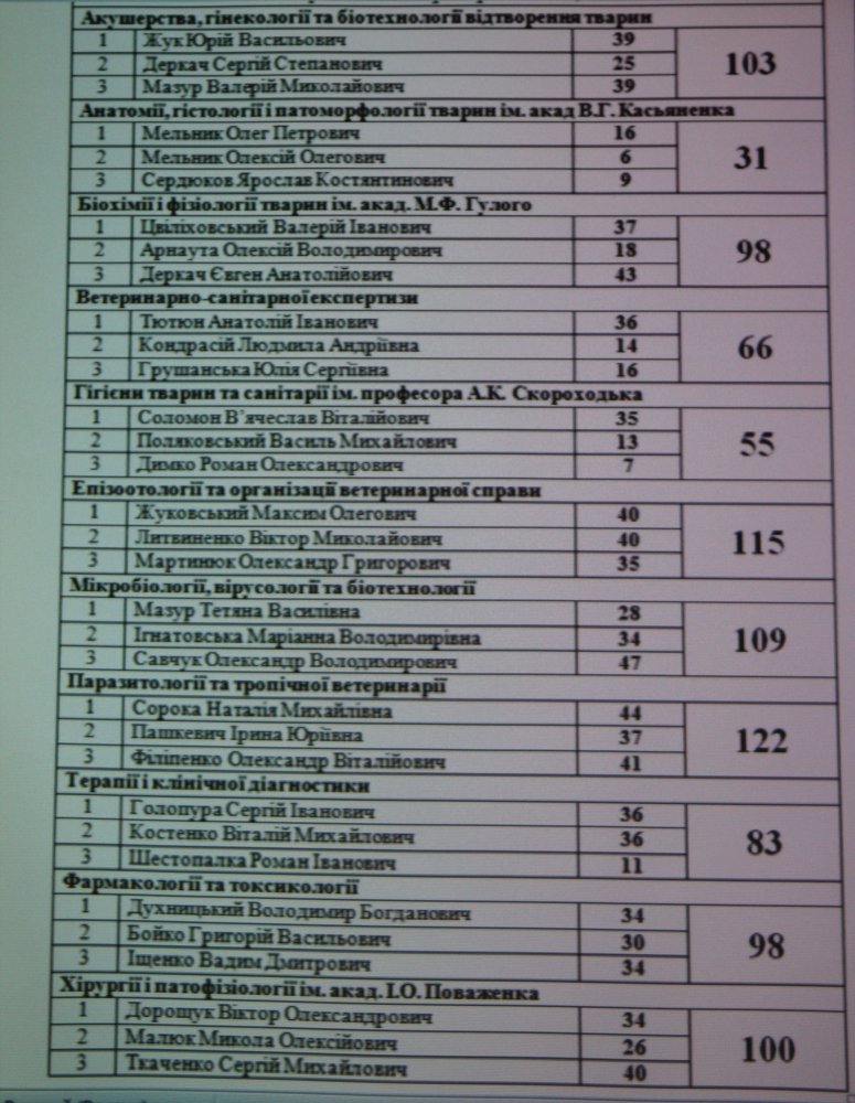 Кафедра епізоотології та організації ветеринарної справи посіла почесне друге місце з результатом 115 балів. Жуковський М.О. - 40 балів, Литвиненко В.М. - 40 балів, Мартинюк О.Г. - 35 балів.
