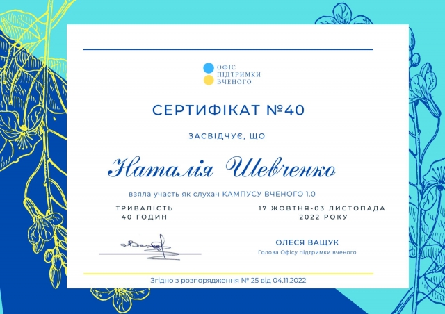 Після закінчення Кампусу вченого кожен учасник отримав сертифікат, який засвідчував участь у кількості 40 годин за підписом голови Ради молодих вчених при МОН України Олесі Ващук.