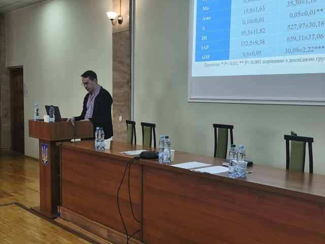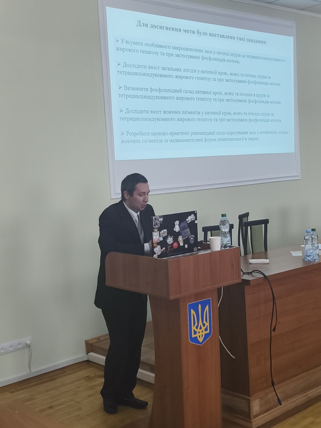 На засіданні відбувся розгляд наукових результатів дисертації здобувача наукового ступеня доктора філософії Бойчука Богдана на тему: «Автономна регуляція ліпідного гомеостазу у кіз» (науковий керівник докт. вет. н., проф. Валентин Карповський, професор кафедри фізіології хребетних і фармакології; експерти: док. вет. наук., доц., Руслана Постой, доцент кафедри громадського здоров’я та нутриціології та док. вет. наук, проф. Лариса Кладницька, професор кафедри фізіології хребетних і фармакології).