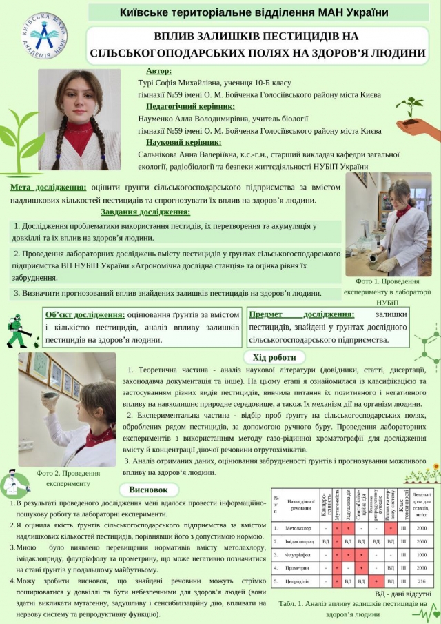 Софія Турі зайняла ІІІ місце ІІ (міського) етапу Всеукраїнського конкурсу-захисту науково-дослідницьких робіт учнів-членів Київського територіального відділення Малої академії наук України у відділенні «Екологія та аграрні науки», секція «Охорона довкілля та раціональне природокористування». «Своєю науково-дослідницькою роботою, я волію донести суспільству, що використання хімічних засобів таких, як пестициди, мають як позитивні риси (для економіки), так і негативні (проблеми їх міграції у довкіллі), що людству слід звернути на це увагу, а спеціалістам – ретельно вивчити особливості та механізми впливу пестицидів на довкілля та живі організми, переглянути і внести корективи у законодавчу документацію з цього приводу з метою запобігання та мінімізації шкідливих наслідків від їх застосування. Мені дуже імпонує думка Джорджа Бернарда Шоу: “Життя полягає не в тому, щоб знайти себе. Життя полягає в тому, щоб створити себе”, з якою я цілком згодна. Тому, я намагаюся приділяти багато часу на саморозвиток, розширення власного кругозору, пробувати щось нове. Переконана, що саме це найкращий шлях, аби усвідомити, що саме мені найбільше припадає до душі», — ділиться Софія Турі.