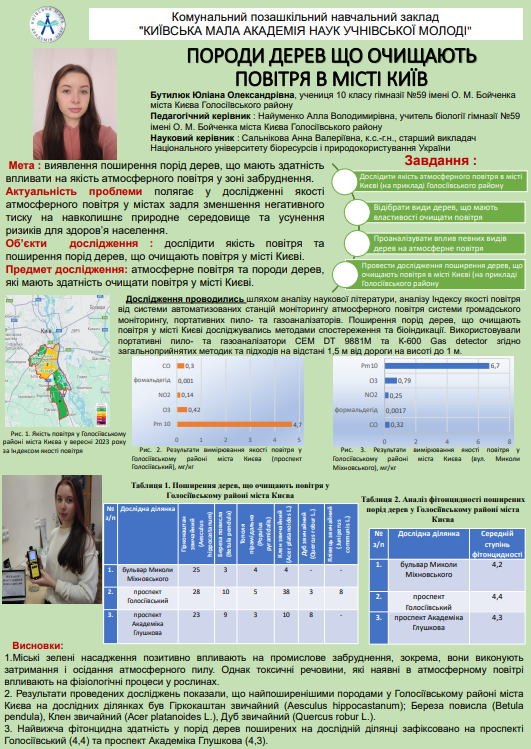 Юліана Бутилюк ІІІ місце ІІ (міського) етапу Всеукраїнського конкурсу-захисту науково-дослідницьких робіт учнів-членів Київського територіального відділення Малої академії наук України у відділенні «Екологія та аграрні науки», секція «Екологія». «За статистичними даними у великих містах значно погіршився стан повітря, у яких фіксується збільшення викидів транспорту та промислових об’єктів шкідливих речовин, що негативно впливає на комфорт, здоров'я та безпеку мешканців міста, а також погіршує екологічну ситуацію в цілому. Прогулюючись Києвом я почала звертати увагу на дерева, і зрозуміла що тільки декілька видів обирають для висадки над тротуаром. Я зацікавилася, чому саме вони? Вибравши цю тему та дізнавшись детальніше про їх особливості; властивості, через які вони здатні очищати повітря й властивості, через які вони виживають при забрудненому повітрі та майже без догляду людини», — говорить Юліана Бутилюк.