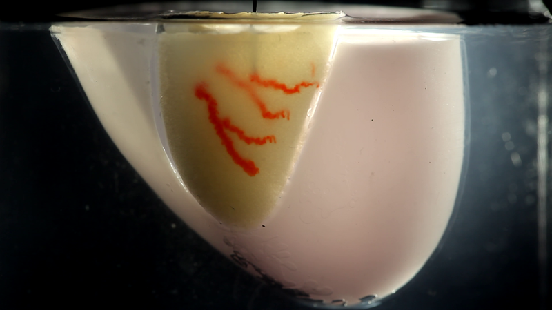 Розгалужена мережа каналів-"судин" (червоного кольору) на основі желатину - 3D-друк у живій структурі серцевої тканини, що складається з мільйонів клітин (жовтого кольору) за допомогою тонкої насадки для імітації судинної системи органів.