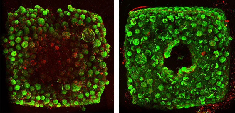 Тканини, створені без надрукованих SWIFT каналів, демонструють загибель клітин (червоні) після 12 годин культивації (ліворуч), тоді як тканини з каналами (праворуч) мають здорові клітини.