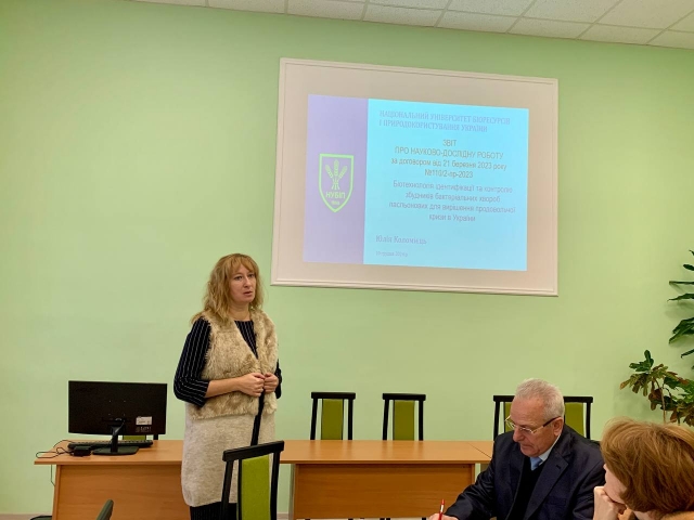 Юлія Коломієць, д-р с.-г. наук та науковий керівник НДР «Біотехнологія ідентифікації та контролю збудників бактеріальних хвороб пасльонових для вирішення продовольчої кризи в України» представила результати за 2024 рік. У результаті бактеріологічного аналізу безсимптомних бульб картоплі виділено різні морфологічні типи ізолятів бактерій, які характеризувалися формуванням колоній різного кольору, розміру, ступеню прозорості та наявністю зморшкуватої або гладенької поверхні та ін. У виділених ізолятів бактерій визначено морфологічні, фізіолого-біохімічні властивості, що дозволило ідентифікувати ізоляти. Ізоляти бактерій, що формують гладенькі, блискучі напівпрозорі колонії сірого кольору і є грамнегативними, оксидазонегативними, рухливими, не спороутворюючими паличками, здатними споживати глюкозу в аеробних та анаеробних умовах і спричинювати мацерацію рослинних тканин віднесено до виду Pectobacterium сarotovorum. У складі епіфітної мікробіоти досліджуваних нами зразків бульб картоплі було виявлено різні за систематичною належністю та функціональними можливостями бактерії. Отримані ізоляти з бульб різних сортів картоплі мали колонії різної форми, жовтого, білого, бежевого, рожевого, коричневого й оранжевого кольорів, прозорі й напівпрозорі, з матовою та глянцевою поверхнею, рівними і нерівними краями. Для кожного сорту картоплі був характерний різний кількісний та якісний склад мікрофлори. Було перевірено вірулентні властивості виділених з бульб ізолятів бактерій на здатність ініціювати РНЧ на листках тютюну, здатність мацерувати шматочки картоплі та спричинювати ураження листкового апарату картоплі. Надано характеристику ізолятів, виділених із бульб картоплі та їх антагоністичної активності. Установлено, що природний комплекс епіфітної мікрофлори бульб картоплі є недостатнім фактором захисту проти розмноження на їх поверхні бактерій, які викликають хвороби. Проте серед виділених ізолятів виявлено такі, що спричиняють утворення зон затримки росту фітопатогенних бактерій, проявляючи слабкі антагоністичні властивості, що дає можливість використовувати ці ізоляти для захисту від бактеріозів природним шляхом. Показано, що уражені бур'яни в посівах культурних рослин є акумуляторами високоагресивних штамів бактерій роду Pectobacterium, які можуть бути збудниками хвороб широкого спектра вирощуваних культур рослин.
