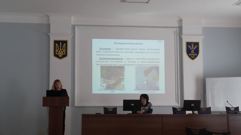 І. Кононенко, асистент кафедри аквакультури у доповіді на тему: «Кріоконсервування сперми стерляді з метою отримання життєстійкого потомства», підкреслила актуальність досліджень в даному напрямку, яка обумовлена різким скороченням запасів цінних осетрових видів риб у природних водоймах. Єдина можливість відновлення чисельності осетрових риб сьогодні є штучне відтворення в умовах аквакультури із застосуванням біотехнологій.