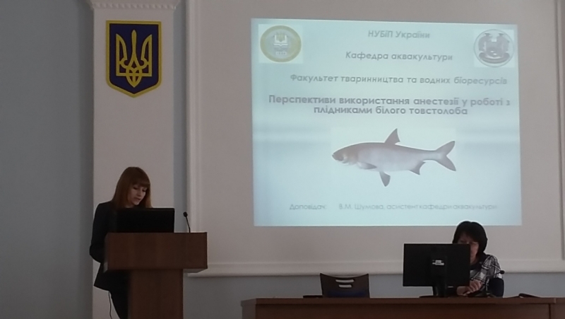 В. Шумова, асистент кафедри аквакультури у доповіді на тему: «Перспективи використання анестезії у роботі з плідниками білого товстолоба», зосередила увагу на актуальності використання анестезії при технологічних маніпуляціях з цінними об'єктами вітчизняної аквакультури – рослиноїдними рибами, що значно зменшує рівень стрес-реакції, збільшуючи термін продуктивного використання цих риб, сприяє збереженню племінного матеріалу і підвищенню ефективності селекційної роботи з ними.
