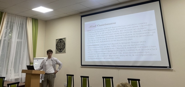 Першим доповідав Костянтин Дерід, тема дисертації якого «Нейробіологічні та когнітивістські підходи до вирішення проблеми свідомості в сучасній науці». В своїй презентації здобувач окреслив предметне поле свого дослідження, розкрив основні нейробіологічні та когнітивістські концепції, які пояснюють природу свідомості. Аспірант наголосив на тому, що його дисертація розробляється в межах аналітичної філософії.